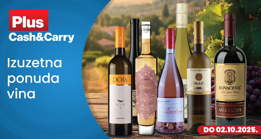 Svaka boca donosi poseban karakter – od laganih i osvežavajućih belih vina, preko aromatičnih tamjanika, do kompleksnih kupaža i elegantnih bermeta. Bilo da pripremate svečanu trpezu, želite da obradujete drage goste ili jednostavno uživate u dobrom vinu posle napornog dana, u Plus Cash&Carry-ju vas očekuje savršen izbor po sjajnim cenama.